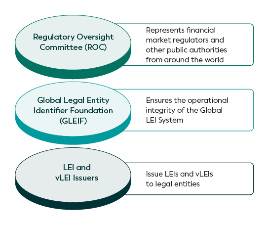 تُعدّ Global Legal Entity Identifier Foundation (GLEIF) التي تأسست سنة 2014، مؤسسة غير ربحية تهدف إلى دعم تنفيذ واستخدام معرّفات الكيانات القانونية. وتضمن الخدمات التي تقدمها GLEIF السلامة التشغيلية لنظام معرّفات الكيانات القانونية العالمي. ويشرف على عمل GLEIF لجنة الرقابة التنظيمية العالمية لمعرّفات الكيانات القانونية، والمؤلفة من ممثلين عن سلطات عامة من مختلف أنحاء العالم. أما جهات إصدار معرّفات الكيانات القانونية، ويُشار إليها كذلك بوحدات التشغيل المحلية (LOUs)، فهي مؤسسات مفوّضة بإصدار معرّفات كيانات قانونية للكيانات القانونية التي تمارس معاملات مالية.