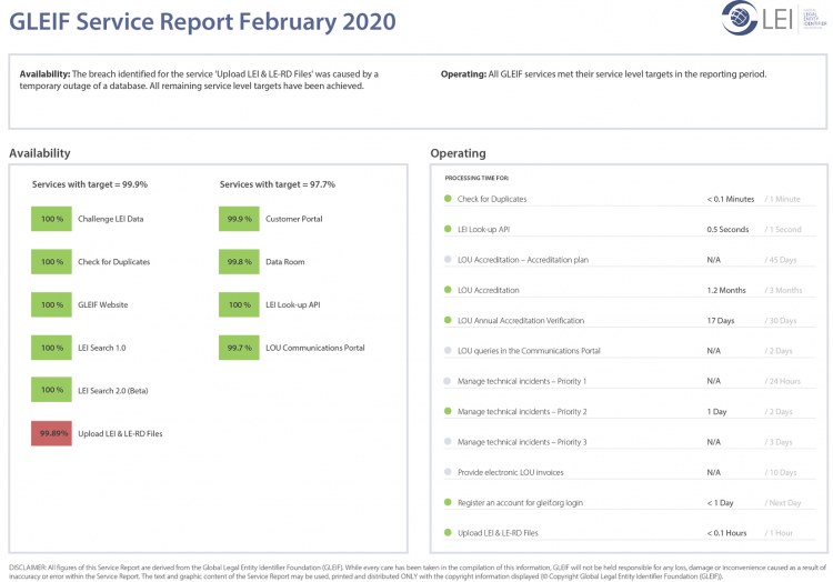 تلتزم Global Legal Entity Identifier Foundation (GLEIF)‎ بضمان تحقيق الشفافية في أدائها فيما يتعلق بالخدمات التي تقدمها GLEIF. ولذلك، فإننا نتيح تنزيل تقارير الخدمات شهريًا، والتي تقيّم أداء GLEIF بشكلٍ عام.