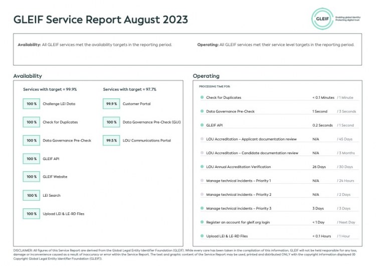 تلتزم Global Legal Entity Identifier Foundation (GLEIF)‎ بضمان تحقيق الشفافية في أدائها فيما يتعلق بالخدمات التي تقدمها GLEIF. ولذلك، فإننا نتيح تنزيل تقارير الخدمات شهريًا، والتي تقيّم أداء GLEIF بشكلٍ عام.