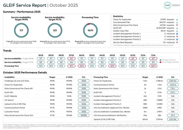 تلتزم Global Legal Entity Identifier Foundation (GLEIF)‎ بضمان تحقيق الشفافية في أدائها فيما يتعلق بالخدمات التي تقدمها GLEIF. ولذلك، فإننا نتيح تنزيل تقارير الخدمات شهريًا، والتي تقيّم أداء GLEIF بشكلٍ عام.