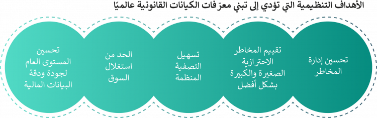 تعتمد السلطات العامة على معرف الكيان القانوني في تقييم المخاطر واتخاذ الخطوات التصحيحية، وإذا لزم الأمر، الحد من إساءة استغلال السوق وتحسين دقة البيانات المالية.