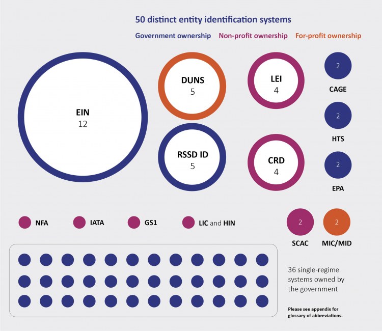 توضح هذه الدراسة البحثية أن الحكومة الفيدرالية الأمريكية تستخدم خمسين نظامًا متميزًا لتعريف الكيانات وجميعها منفصلة وغير متوافقة مع بعضها البعض. ولذلك، لا يزال تعريف الكيانات يمثل تحديًا كبيرًا للعديد من مهام الوكالات الفيدرالية. ويجب على أي وكالة تتتبع كيانات غير فيدرالية من أجل أداء وظيفة تنظيمية أو إحصائية أو شرائية أو مساعدة، إما أن تنشئ نظام تعريف الكيانات الخاص بها أو تتبنى نظامًا تم إنشاؤه أصلاً بواسطة وكالة أخرى. ويتمثل في كلا النهجين صعوبات في مطابقة الكيانات وتحديد المسؤولية القانونية بشكل صحيح.