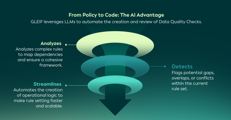 تستخدم GLEIF نماذج السياسات الضخمة (LLMs) لدعم تحديد القواعد الجديدة والمساعدة في اكتشاف التناقضات المحتملة مع عمليات التحقق من جودة البيانات الحالية، مما يتيح عملية مراجعة شاملة - بدءًا من الوثائق التنظيمية والسياسات وحتى تنفيذها.