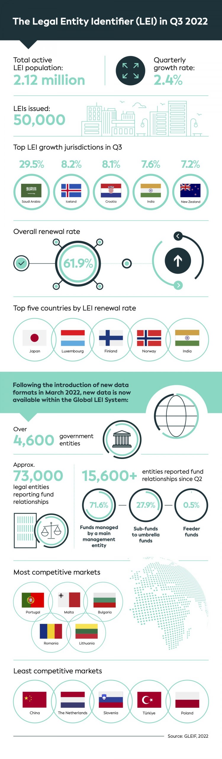 ارتفع معدل تجديد معرف الكيانات القانونية الإجمالي للربع الثالث من 2022 إلى 61.9% حيث شهدت عمليات التجديد الربع سنوية ارتفاعًا عبر كل من الولايات القضائية داخل الاتحاد الأوروبي (64.5%) والولايات القضائية خارج الاتحاد الأوروبي (57.2%). وقد شهدت اليابان مرة أخرى أعلى معدل تجديد (91.4%) ثم تلتها لوكسمبورغ (89.7%)، وفنلندا (88.2%)، والنرويج (81.6%)، والهند (80.4%).