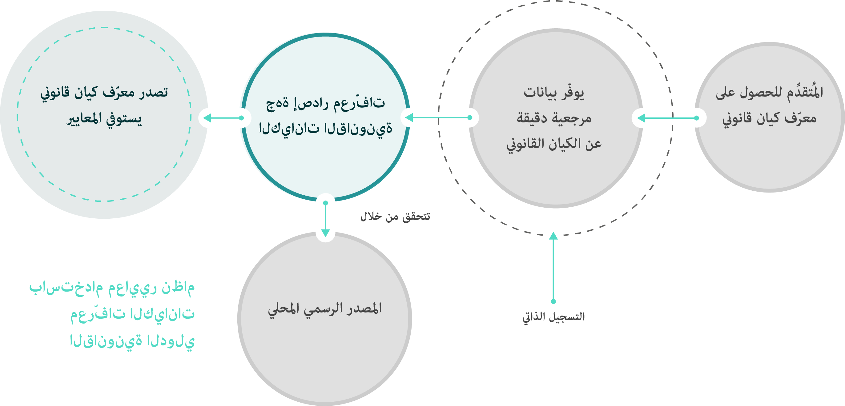 وبعد ذلك يجب على جهة إصدار معرّفات الكيانات القانونية التحقق من البيانات المرجعية من خلال الرجوع إلى سُلطة التسجيل المحلية - سجل تجاري وطني على سبيل المثال - وإصدار معرّف كيان قانوني يتوافق مع معيار معرّفات الكيانات القانونية.