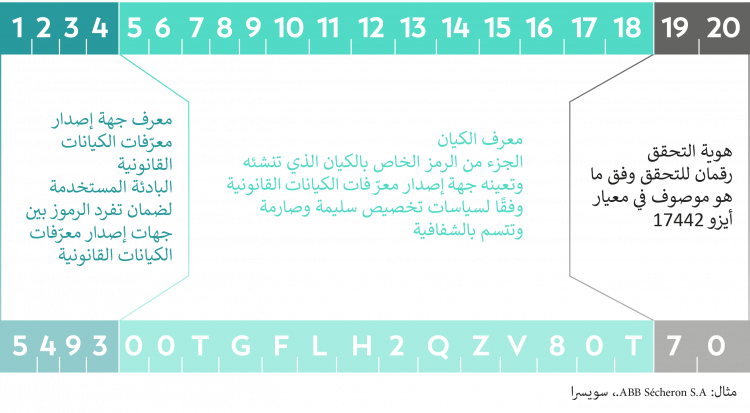 - الخانتان 1-4: بادئة لضمان الاختلاف بين الرموز من جهات إصدار معرّفات الكيانات القانونية (وحدات التشغيل المحلية).