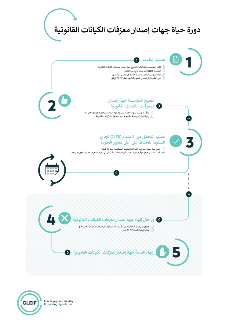 يُمكنك قراءة المزيد حول اعتماد GLEIF لجهات إصدار معرّفات الكيانات القانونية، بما في ذلك المراحل المختلفة لدورة الحياة: