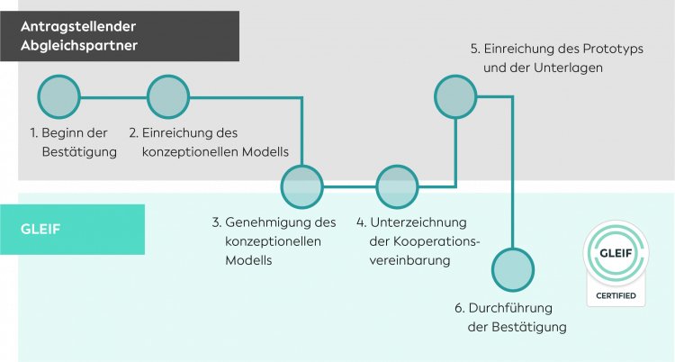 - Sobald der Geschäftsführer von GLEIF die Teilnahme an der Abgleichszertifizierung genehmigt hat, schließen der antragstellende Abgleichspartner und GLEIF den Kooperationsvertrag ab. Dabeihandelt es sich um einen formellen, bindenden Vertrag, der diePflichten beider Parteien definiert.