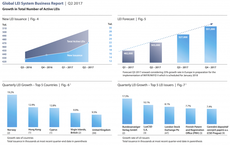 Zum Ende des zweiten Quartals 2017 gab es rund 503.000 aktive LEIs, die von 30 LEI-Vergabestellen verwaltet wurden. Die LEIs stehen stellvertretend für Rechtsträger aus 200 Ländern. Bloomberg Finance LP hat damit begonnen, LEIs als akkreditierte LEI-Vergabestelle zu vergeben. Bronnoysund Register Centre hat die Übertragung seiner verwalteten LEIs abgeschlossen und seine Aktivitäten eingestellt. Erstmals wurden LEIs in Suriname vergeben. Die USA sind nach wie vor der größte Markt. Dort wurde der Gesamtanteil um einen Prozentpunkt im Vergleich zum vorhergehenden Quartal erhöht und liegt nun bei 26 % aller bisher vergebenen LEIs.