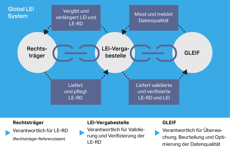 Der Prozess zur Aufrechterhaltung der LEI-Datenqualität beginnt mit dem sich registrierenden Rechtsträger. Im Rahmen der Selbstregistrierung muss der registrierende Rechtsträger akkurate LEI-Referenzdaten liefern. Die LEI-Vergabeorganisation (auch „Local Operating Unit“ genannt) muss dann die LEI-Referenzdaten bei den lokalen, autorisierten Stellen – zum Beispiel ein nationales Gesellschaftsverzeichnis – verifizieren und dann einen dem LEI-Standard konformen LEI vergeben. LEI-Vergabeorganisationen agieren als primäre Schnittstellen für Rechtsträger, die für einen LEI registriert sind oder einen LEI erhalten möchten.