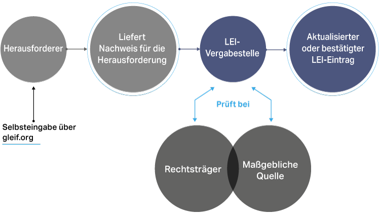 Nachdem eine Herausforderung über das auf der GLEIF-Website verfügbare Online-Formular eingesendet wurde, wird GLEIF die Informationen unverzüglich an die zuständige LEI-Vergabeorganisation zur weiteren Bearbeitung weiterleiten. Es liegt in der Verantwortung der zuständigen LEI-Vergabeorganisation die Angelegenheit im Dialog mit dem betroffenen Rechtsträger beizulegen. Sofern erforderlich und vorbehaltlich einer weiteren Verifizierung gegenüber einer maßgeblichen Quelle wird die LEI-Vergabestelle dann die Informationen zu einem LEI-Eintrag aktualisieren. Ziel ist die Erledigung einer Herausforderung innerhalb von zehn Geschäftstagen.