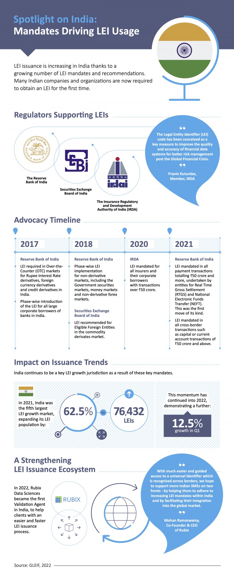 In einer separaten, aber ergänzenden Entwicklung wurde das Global Legal Entity Identifier System vor Kurzem erweitert, um eine weitere erwartete Zunahme der regionalen LEI-Nachfrage zu bedienen. Im März 2022 gab Rubix Data Sciences bekannt, dass das Unternehmen erste Validierungsstelle in Indien geworden ist. Rubix wird mit Legal Entity Identifier India Ltd. (LEIL), einer von GLEIF akkreditierten LEI-Vergabestelle und einer hundertprozentigen Tochtergesellschaft der Clearing Corporation of India Ltd. zusammenarbeiten, um Kunden bei der Beantragung von LEIs zu unterstützen.