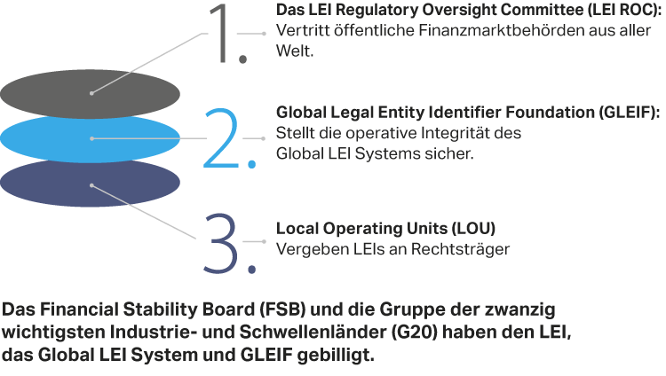 Der LEI ist ein zwanzigstelliger, alphanumerischer Code, der auf dem von der Internationalen Organisation für Normung (ISO) entwickelten Standard ISO 17442 basiert Er ist mit wesentlichen Referenzdaten verbunden, die eine klare und eindeutige Identifikation der Rechtsträger, die an Finanztransaktionen beteiligt sind, ermöglichen. Die Referenzdaten enthalten Informationen zu einem Rechtsträger, der sich über einen LEI identifizieren lässt. Der ISO 17442 Standard definiert einen Satz von Attributen oder LEI-Referenzdaten, die die grundlegendsten Elemente der Identifikation darstellen. Er bestimmt die Mindestreferenzdaten, die für jeden LEI eingereicht werden müssen: