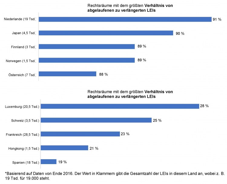 Es ist jedoch zu beachten, dass die einzelnen LEIs, die die gesamte Population an abgelaufenen LEIs zu einem Zeitpunkt bilden, erheblich variieren. Anfang 2017 analysierte GLEIF abgelaufene LEIs in verschiedenen Rechtsräumen mit mehr als 1.000 LEIs. Diese Analyse hat verschiedene Muster betreffend die folgenden Metriken identifiziert (angewandt, um die Anteile abgelaufener LEIs für 2015 bzw. 2016 auf Länderbasis zu vergleichen):
