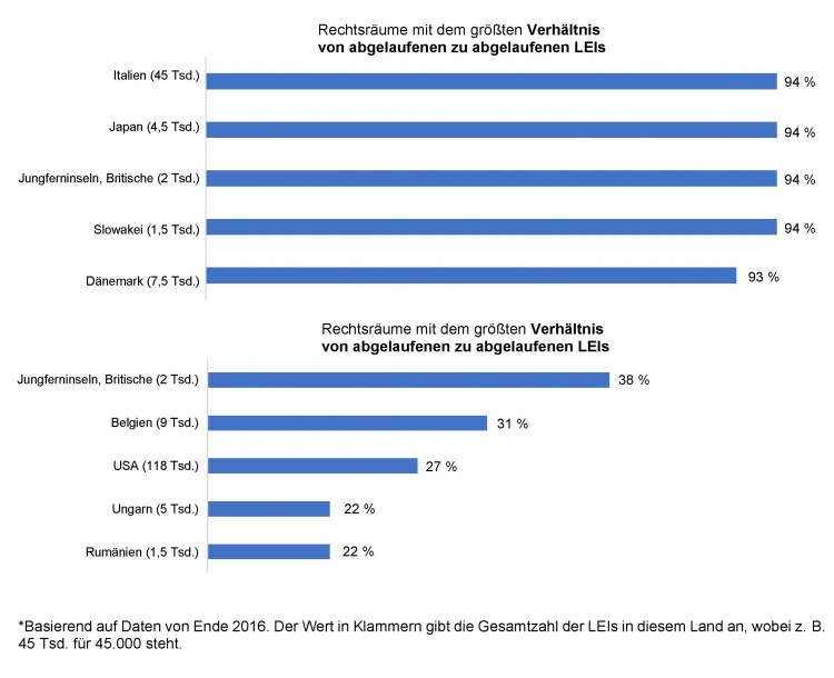 Verhältnis von abgelaufenen zu abgelaufenen LEIs: Dies ist der Anteil der LEIs, die 2015 bereits abgelaufen waren und auch 2016 nicht verlängert wurden; er repräsentiert also die Rechtsträger, die offenbar beschlossen haben, über einen längeren Zeitraum gegen die einschlägige Richtlinie zu verstoßen.