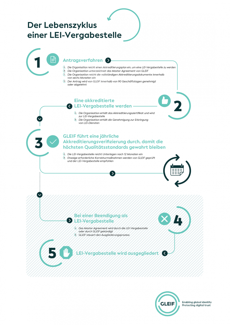 Weitere Informationen zur Zulassung von LEI-Vergabestellen durch GLEIF, einschließlich der verschiedenen Phasen des Lebenszyklus, erhalten Sie hier: