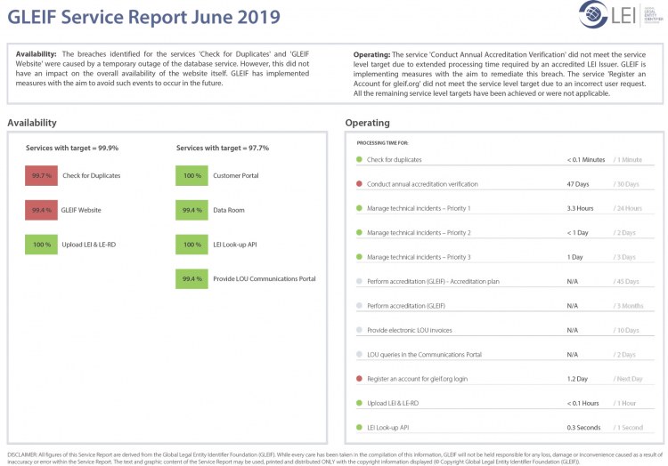The Global Legal Entity Identifier Foundation (GLEIF) is committed to ensuring transparency on its performance with regard to the services offered by GLEIF. We therefore, make available for download monthly service reports evaluating overall GLEIF performance.