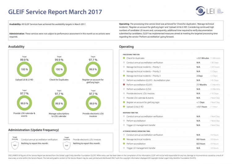 The Global Legal Entity Identifier Foundation (GLEIF) is committed to ensuring transparency on its performance with regard to the services offered by GLEIF. We therefore, make available for download monthly service reports evaluating overall GLEIF performance.