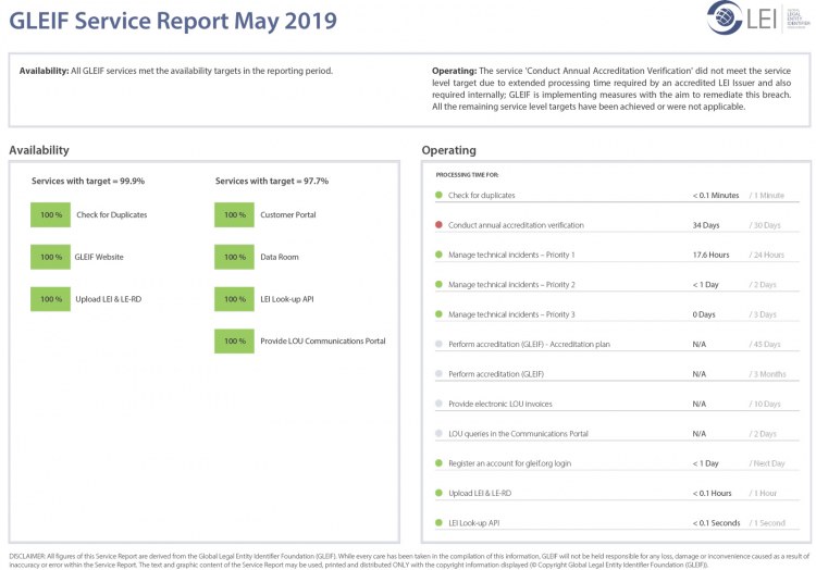 The Global Legal Entity Identifier Foundation (GLEIF) is committed to ensuring transparency on its performance with regard to the services offered by GLEIF. We therefore, make available for download monthly service reports evaluating overall GLEIF performance.