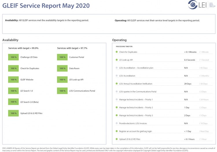 The Global Legal Entity Identifier Foundation (GLEIF) is committed to ensuring transparency on its performance with regard to the services offered by GLEIF. We therefore, make available for download monthly service reports evaluating overall GLEIF performance.