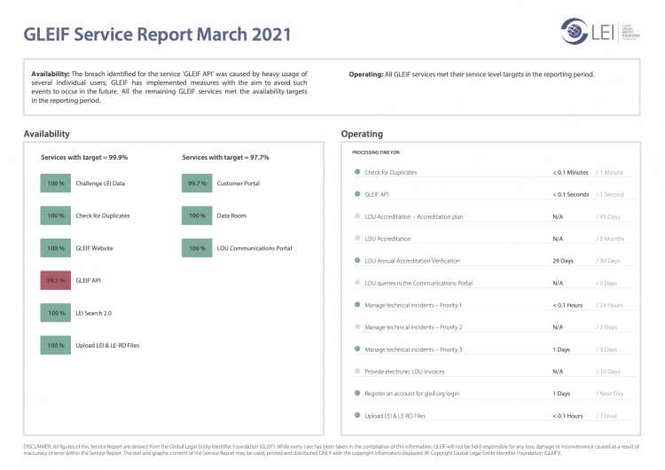 The Global Legal Entity Identifier Foundation (GLEIF) is committed to ensuring transparency on its performance with regard to the services offered by GLEIF. We therefore, make available for download monthly service reports evaluating overall GLEIF performance.