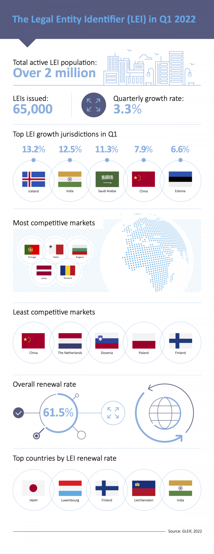 The overall renewal rate for Q1 2022 was 61.5%, marginally lower than the previous quarter (62.5%). Still, at the end of the quarter, 63.8% of all LEIs were in good standing (last quarter: 64.7%).