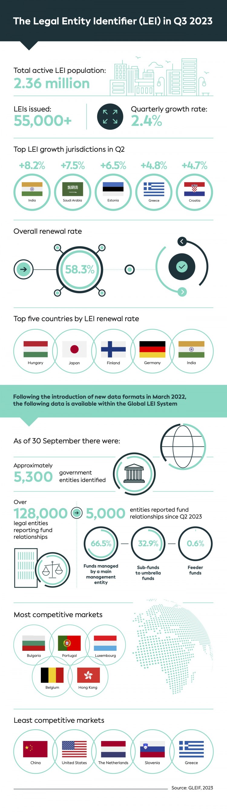 The latest report, covering Q3 2023, highlights that over 55,000 LEIs were issued globally throughout the quarter. At the end of the quarter, the total active LEI population was around 2.36 million. This represents a quarterly growth rate of 2.4%.