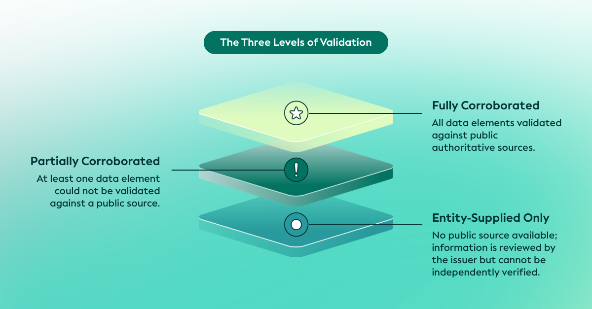The Global LEI System uses three levels to indicate the extent to which data has been corroborated: