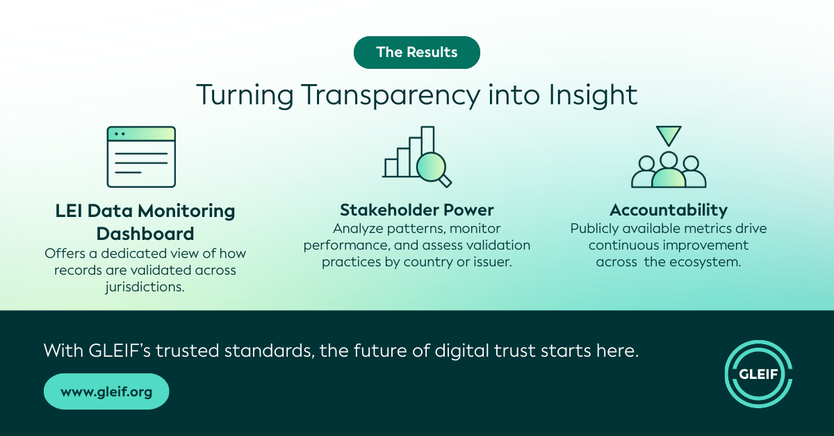 The corresponding Registration Authority ID and Validation Authority ID, together with the entity’s registration identifier, are included in each LEI record. This creates transparency by allowing any data user to see exactly which source was used for validation.