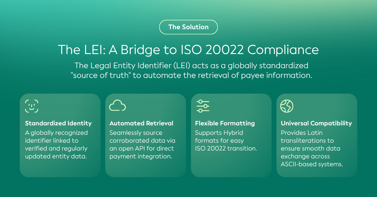 Among the various benefits this delivers – and in response to the industry need outlined in our recent Pulse Poll – it is important to highlight that the LEI simplifies retrieving beneficiaries' names and addresses. This can enable precise, instant, and automatic identification across borders to support more effective and efficient payee verification: