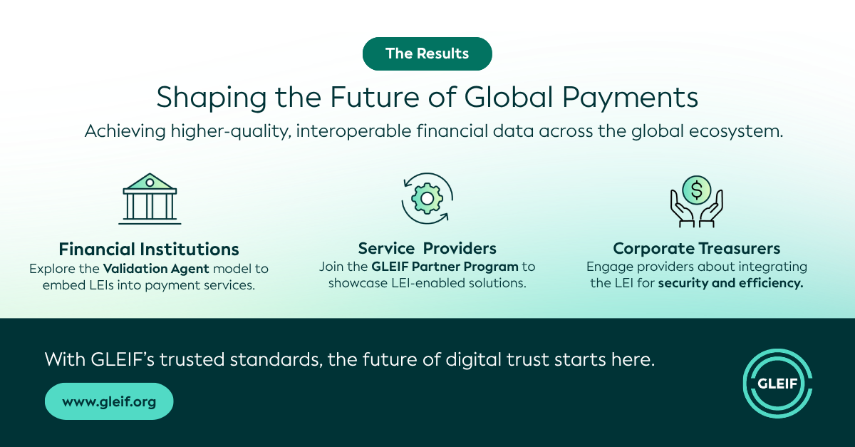 Financial Institutions: Contact GLEIF to explore the Validation Agent model and discover how to embed the LEI into your payment services.