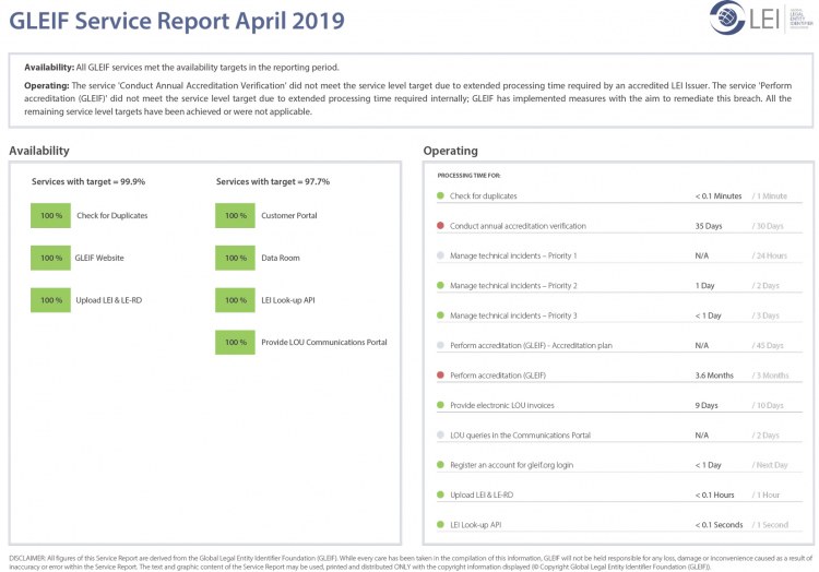 La Global Legal Entity Identifier Foundation (GLEIF) tiene un firme compromiso con garantizar la transparencia en la prestación de los servicios que ofrece. Por tanto, ofrecemos la posibilidad de descargar informes de servicio mensuales que evalúan el rendimiento general de la GLEIF.