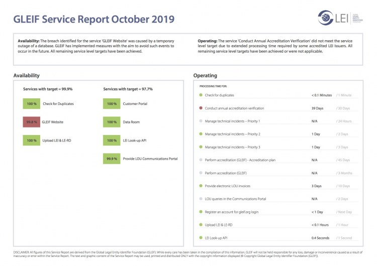 La Global Legal Entity Identifier Foundation (GLEIF) tiene un firme compromiso con garantizar la transparencia en la prestación de los servicios que ofrece. Por tanto, ofrecemos la posibilidad de descargar informes de servicio mensuales que evalúan el rendimiento general de la GLEIF.