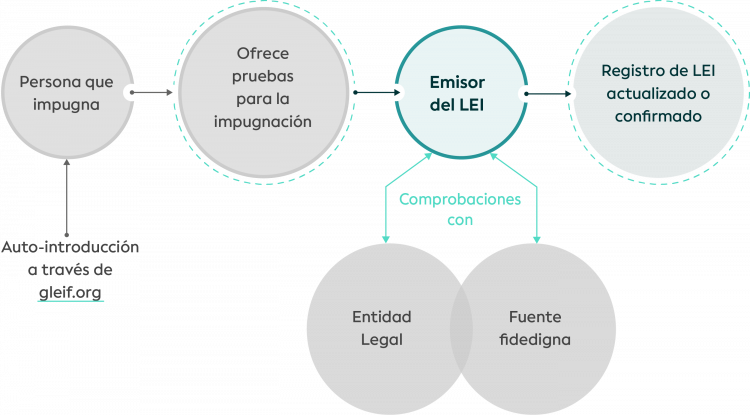 En caso de que se cuestione la corrección de un registro de datos de IPJ a través del servicio de impugnación de la GLEIF, es responsabilidad de la organización emisora de IPJ pertinente resolver la cuestión en diálogo con la persona jurídica afectada. Si es necesario, y sujeto a una verificación adicional con una fuente autorizada, el emisor del IPJ actualizará la información relacionada con un registro de IPJ. El Emisor del IPJ tiene como objetivo resolver una impugnación en un plazo de diez días hábiles.