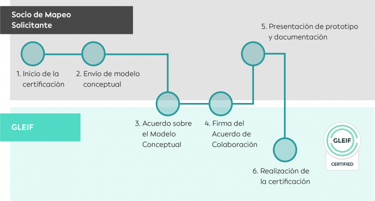 Durante la solicitud de certificación, el socio de mapeo documenta la naturaleza y el alcance de las metodologías o procesos de mapeo. Esto permite a la GLEIF revisar los procesos y procedimientos, validar los datos de muestra del socio de mapeo y determinar si los datos de muestra cumplen o superan los criterios de precisión y calidad predeterminados por la GLEIF. En caso de resultado positivo, se confirma la certificación de la GLEIF.