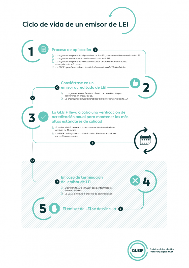 Consulte más información sobre la acreditación por parte de la GLEIF de los emisores de IPJ, incluidas las diferentes etapas del ciclo de vida: