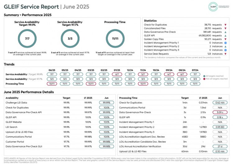 La Global Legal Entity Identifier Foundation (GLEIF) s'engage à garantir la transparence des performances d'exécution de ses services. Vous pouvez donc télécharger les rapports de services mensuels qui évaluent les performances générales de la GLEIF.