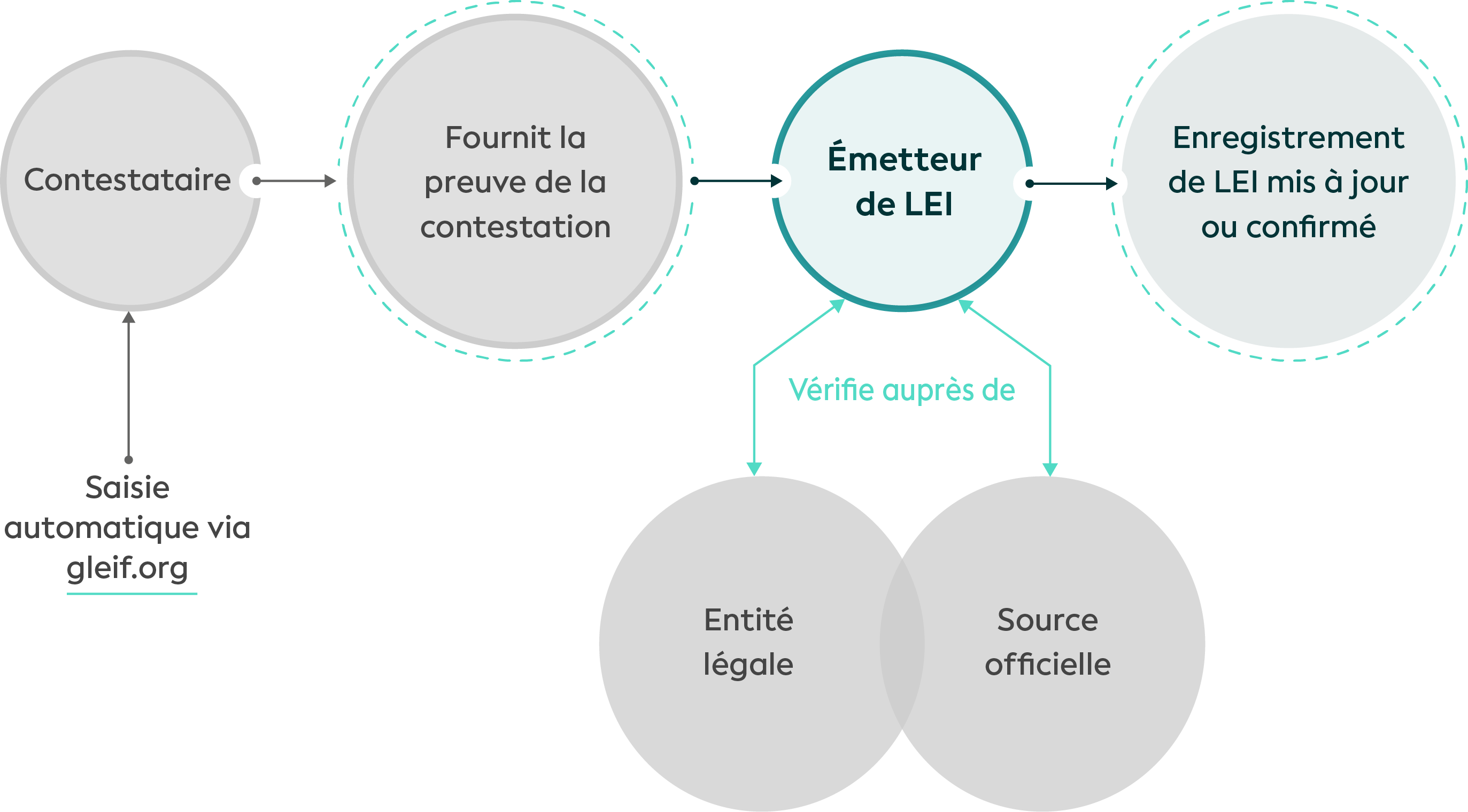 Toutes les parties intéressées peuvent soumettre une contestation à l'encontre de l'enregistrement de données LEI concernant un LEI. De nouvelles données peuvent être suggérées car jugées plus précises, ou (si les données correctes sont inconnues, par exemple) des commentaires peuvent être fournis pour indiquer pourquoi un champ de données doit être mis à jour.