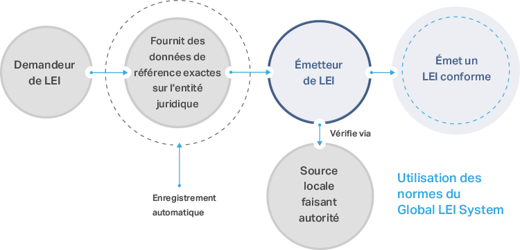 L’utilisation de la Liste des autorités d'enregistrement de la GLEIF: Comme nous l’avons précisé plus haut, l'organisation émettrice du LEI doit vérifier les données de référence des LEI fournies par un demandeur auprès de la source locale faisant foi avant d’émettre un LEI. La GLEIF publie la ‘Liste des autorités d’enregistrement’. Elle contient plus de 650 registres du commerce et autres sources officielles d'enregistrement pertinentes et attribue un code unique à chaque registre de la liste. Les organisations émettrices de LEI référencent ensuite ce code dans leurs processus d’émission de LEI et le publient avec l’enregistrement de LEI. La Liste des autorités d'enregistrement uniformise pour la première fois la référence croisée fournie par l'entité juridique avec sa source officielle locale. Grâce à cette liste, la GLEIF permet aux utilisateurs de données associées au LEI de relier plus facilement le LEI à d'autres sources de données.