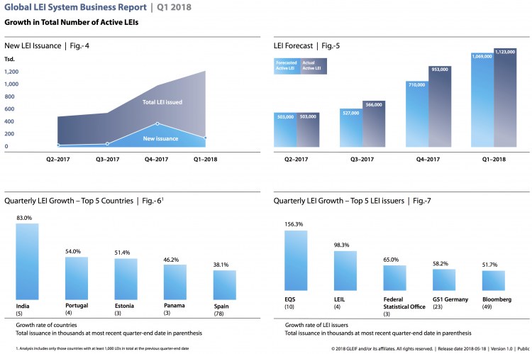 En mai 2018, la Global Legal Entity Identifier Foundation (GLEIF) a publié son dernier rapport trimestriel ; celui-ci met en lumière les principales évolutions relatives à l'adoption de l'identifiant d'entité juridique (LEI). Plus précisément, les rapports évaluent la croissance annuelle et les attentes concernant les renouvellements, estiment le degré de concurrence entre les organisations émettrices de LEI opérant au sein du Global LEI System et analysent les taux de renouvellement et de confirmation des données de référence des LEI. La GLEIF inclut également des statistiques au sujet des informations sur les sociétés mères directes et ultimes fournies par les entités juridiques.