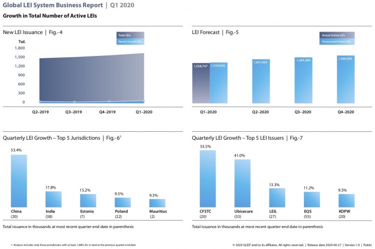 À la fin du premier trimestre 2020, le nombre total de LEI était d'environ 1,56 million. Plus de 76 000 LEI ont été émis au cours de ce trimestre, contre environ 60 000 au cours du trimestre précédent. Cela représente un taux de croissance trimestriel de 5,2% (trimestre précédent: 4,2%).