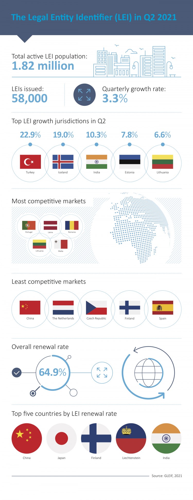 Selon le dernier rapport relatif au deuxième trimestre 2021, 58 000 nouveaux LEI ont été émis dans le monde au cours de cette période. Les émissions ont légèrement fléchi par rapport au trimestre précédent (68 000 émises au premier trimestre), mais cette tendance est assez courante pendant le deuxième trimestre en raison des mois d'été plus calmes. La situation globale est très encourageante. Au deuxième trimestre 2021, les émissions totales de LEI ont augmenté de 3,3 % et le nombre total de LEI actifs s'élève désormais à 1,82 million.