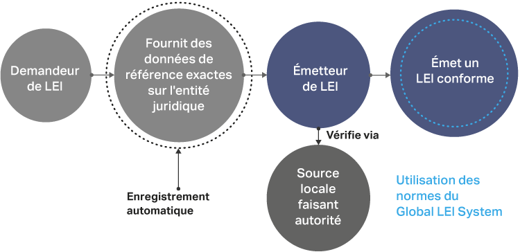 Le processus visant à assurer la qualité des données associées au LEI commence avec l'entité qui s'enregistre. À travers l'auto-enregistrement, l'entité qui s'enregistre doit fournir des données de référence juridiques précises sur elle-même à l'organisme émetteur de LEI de son choix. Les émetteurs de LEI (également appelés « unités opérationnelles locales » ou UOL) fournissent entre autres des services d'enregistrement et de renouvellement, et font office d'interface principale pour les entités juridiques souhaitant obtenir un LEI.