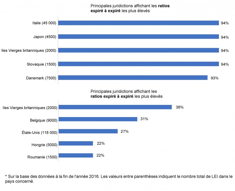 ratio émis à expiré: il s'agit du ratio de LEI qui affichaient un statut valide à la fin 2015 et qui ont expiré en 2016. Dans ce cas, les entités juridiques ont omis de renouveler leur LEI dans le délai maximal d'un an.