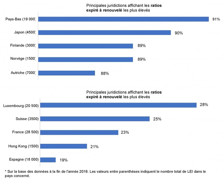 ratio expiré à renouvelé: il s'agit du ratio de LEI qui avaient déjà expiré fin 2015, mais qui ont été renouvelés en 2016. Dans ce cas, les entités juridiques n'ont renouvelé leur LEI qu'après la date de renouvellement convenue au préalable.