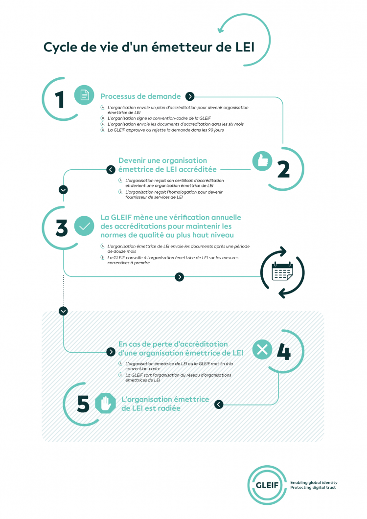 Pour en savoir plus sur l'accréditation des émetteurs de LEI par la GLEIF, y compris sur les différentes étapes du cycle de vie :