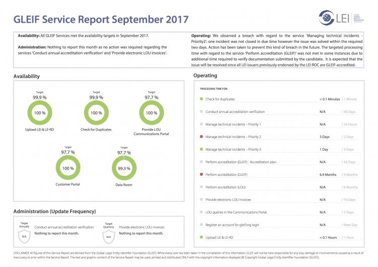 Global Legal Entity Identifier Foundation (GLEIF) berkomitmen untuk memastikan transparansi kinerjanya sehubungan dengan layanan yang ditawarkan oleh GLEIF. Oleh karena itu, kami menyediakan dokumen unduhan laporan layanan bulanan yang mengevaluasi kinerja GLEIF secara keseluruhan.