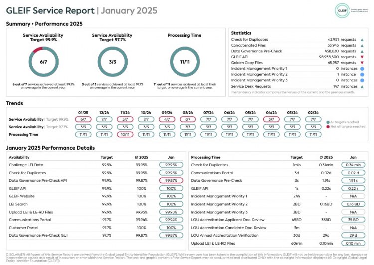 Global Legal Entity Identifier Foundation (GLEIF) berkomitmen untuk memastikan transparansi kinerjanya sehubungan dengan layanan yang ditawarkan oleh GLEIF. Oleh karena itu, kami menyediakan dokumen unduhan laporan layanan bulanan yang mengevaluasi kinerja GLEIF secara keseluruhan.