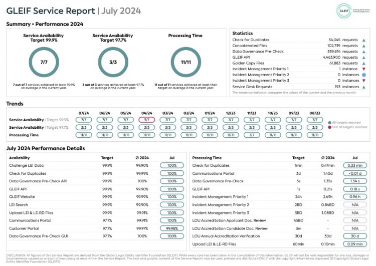 Global Legal Entity Identifier Foundation (GLEIF) berkomitmen untuk memastikan transparansi kinerjanya sehubungan dengan layanan yang ditawarkan oleh GLEIF. Oleh karena itu, kami menyediakan dokumen unduhan laporan layanan bulanan yang mengevaluasi kinerja GLEIF secara keseluruhan.