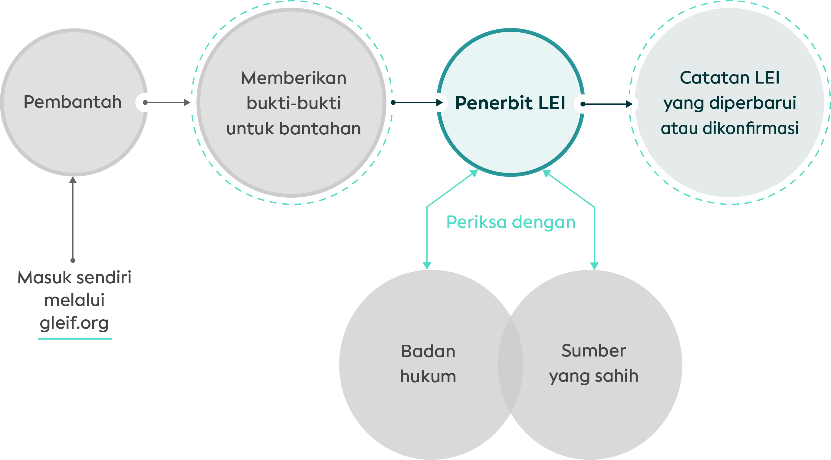Apabila kebenaran catatan data LEI dipertanyakan melalui fasilitas pembantahan GLEIF, organisasi penerbit LEI yang relevan bertanggung jawab menyelesaikan masalah melalui dialog dengan badan hukum yang terkena dampak. Jika diperlukan, dan tergantung pada verifikasi lebih lanjut dengan sumber otoritatif, penerbit LEI akan memperbarui informasi yang berkaitan dengan catatan LEI. Penerbit LEI akan berupaya menyelesaikan tantangan dalam sepuluh hari kerja.
